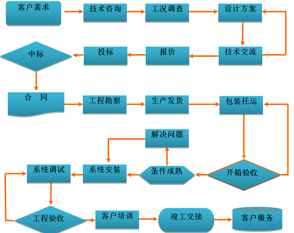 我公司經過多年的經驗總結,形成了一套完整合理的客戶服務流程體系,服務流程包括銷售服務、系統(tǒng)設計、采購、生產、檢驗、工程實施、投運、維護等各個環(huán)節(jié)。公司對相關的服務流程持續(xù)的完善和優(yōu)化,使系統(tǒng)服務的質量管理更加標準化、程序化、規(guī)范化,為系統(tǒng)服務工作奠定了扎實的基礎。